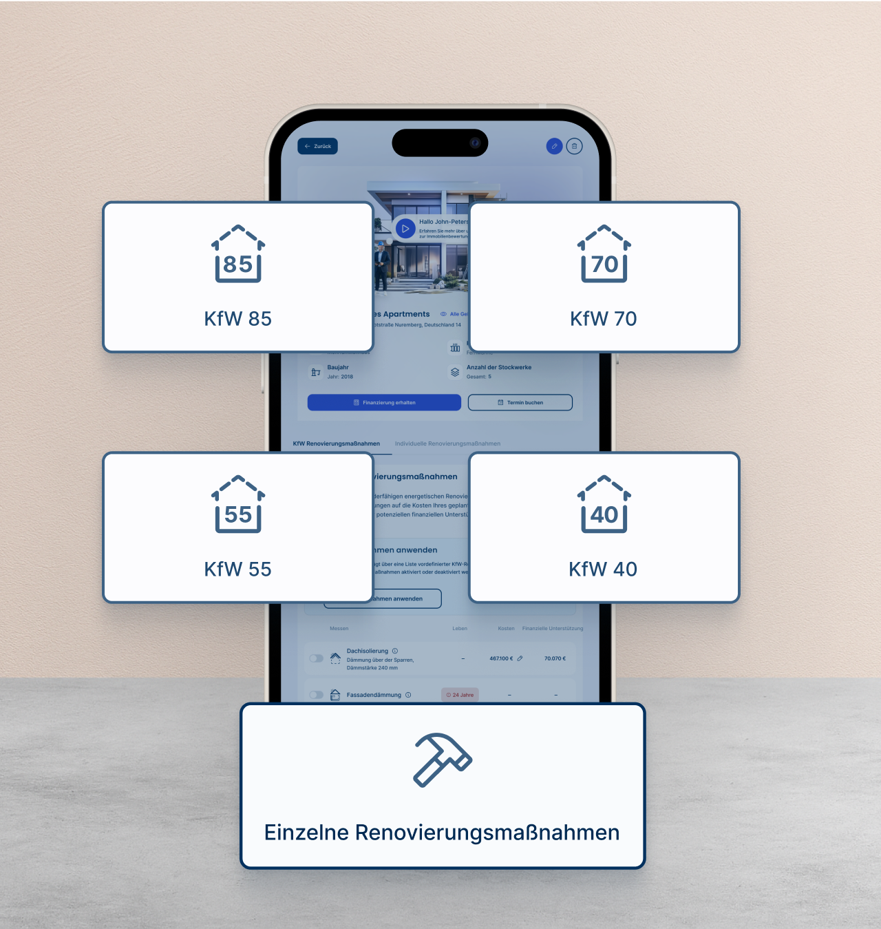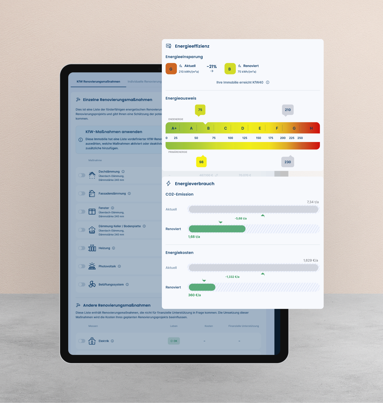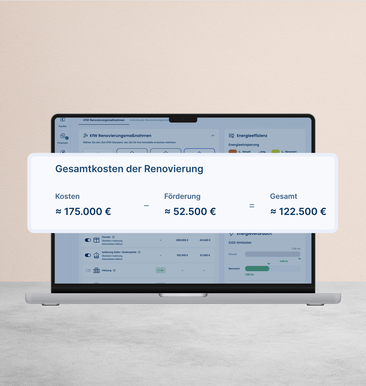 Erhalten Sie einen Sanierungsvorschlag nach KfW-Standards oder stellen Sie eigene Maßnahmen zusammen. Inklusive Kostenschätzung, CO₂-Einsparung, Effizienzgewinn und möglicher Förderungen.
